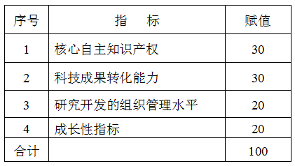 指标计算与赋值说明: 1.四项指标赋予不同的数值(简称“赋值”);企业不拥有核心自主知识产权的赋值为零。 2.每项指标分数比例分为六个档次(A,B,C,D,E,F),分别是:0.80-1.0、0.60-0.79、0.40-0.59、0.20-0.39、0.01-0.19、0; 3.各项指标实际得分=本指标赋值分数比例; [例]某指标赋值20,指标评价档次为“B”,分数比例评为0.7, 则:实际得分=20分×0.7=14分 4.评价指标以申报之日前3个年度的数据为准。如企业创办期不足3年,以实际经营年限为准。 5.各项指标的选择均为单选。 一、核心自主知识产权指标 企业拥有的专利、软件著作权、集成电路布图设计专有权、植物新品种等核心自主知识产权的数量(不含商标)。 □A. 6项,或1项发明专利 □B. 5项 □C. 4项, □D. 3项 □E. 1~2项 □F. 0项 说明: 1.由专家对企业申报的核心自主知识产权是否符合《工作指引》要求进行评判。 2.同一知识产权在国内外的申请、登记只记为一项。 3.若知识产权的创造人与知识产权权属人分离,在计算知识产权数量时可分别计算。 4.专利以获得授权证书为准。 5.企业不具备核心自主知识产权的不能认定为高新技术企业。 二、科技成果转化能力指标 最近3年内科技成果转化的年平均数。 □A. 4项以上 □B. 3~4项(不含3项) □C. 2~3项(不含2项) □D. 1~2项(不含1项) □E. 1项 □F. 0项 说明: 1.同一科学技术成果(专利、版权、技术使用许可证、注册的软件版权、集成电路布图设计)在国内外的申请只记为一项。 2.购入或出售技术成果以正式技术合同为准。 3.此项评价可计入技术诀窍,但价值较小的不算在内。从产品或工艺的改进表现来评价技术诀窍等的价值大小(企业可以不披露具体内容)。 4.技术成果转化的判断依据是:企业以技术成果形成产品、服务、样品、样机等。 三、研究开发的组织管理水平指标 (1)制定了研究开发项目立项报告;(2)建立了研发投入核算体系;(3)开展了产学研合作的研发活动;(4)设有研发机构并具备相应的设施和设备;(5)建立了研发人员的绩效考核奖励制度。 □A. 5项都符合要求 □B. 4项符合要求 □C. 3项符合要求 □D. 2项符合要求 □E .1项符合要求 □F.均不符合要求 四、总资产和销售额成长性指标 此项指标是对反映企业经营绩效的总资产增长率和销售增长率的评价(各占10分),具体计算方法如下 : 总资产增长率=1/2(第二年总资产额÷第一年总资产额+第三年总资产额÷第二年总资产额)-1。 销售增长率=1/2(第二年销售额÷第一年销售额+第三年销售额÷第二年销售额)-1; 用计算所得的总资产增长率和销售增长率分别对照下表指标评价档次(ABCDE)评出分数比例,用分数比例乘以赋值计算出每项得分,两项得分相加计算出总资产和销售额成长性指标实际得分。